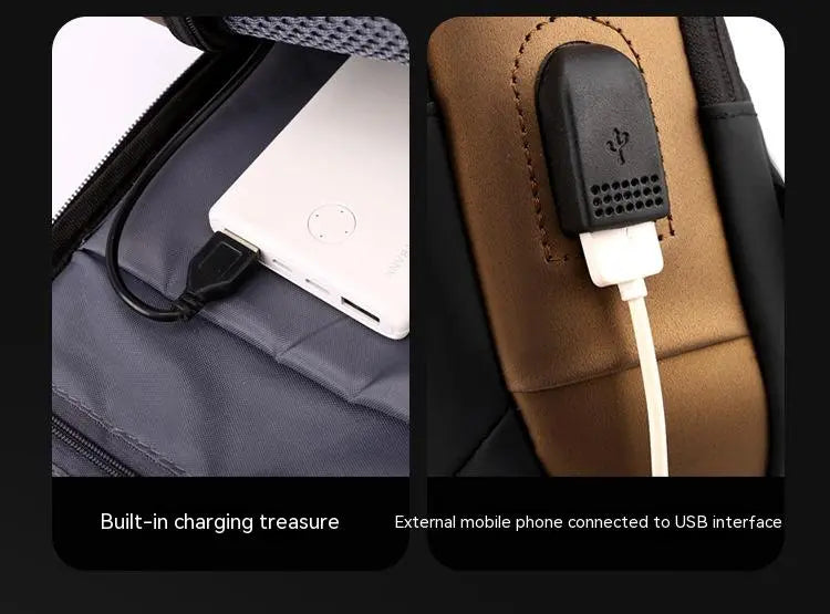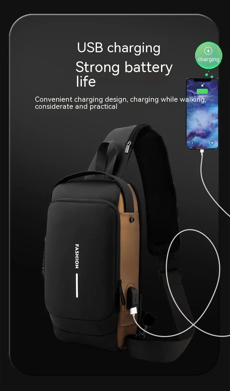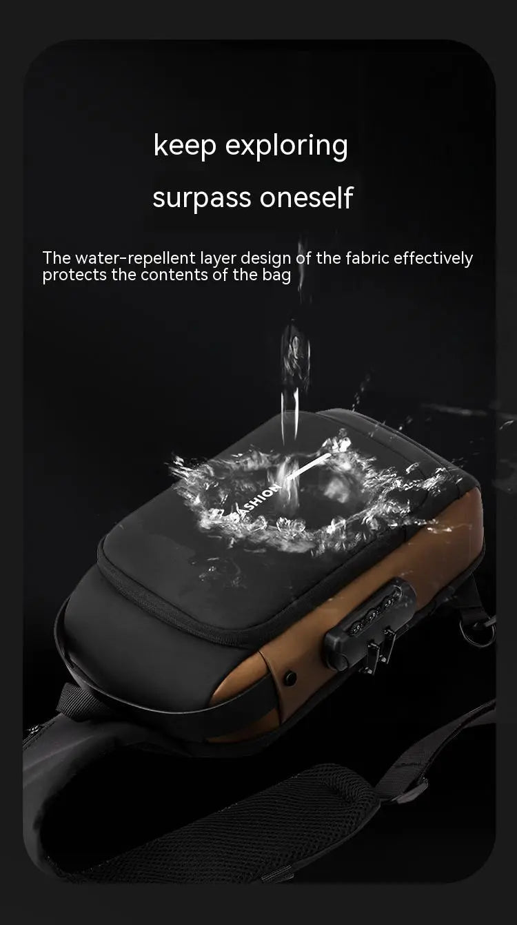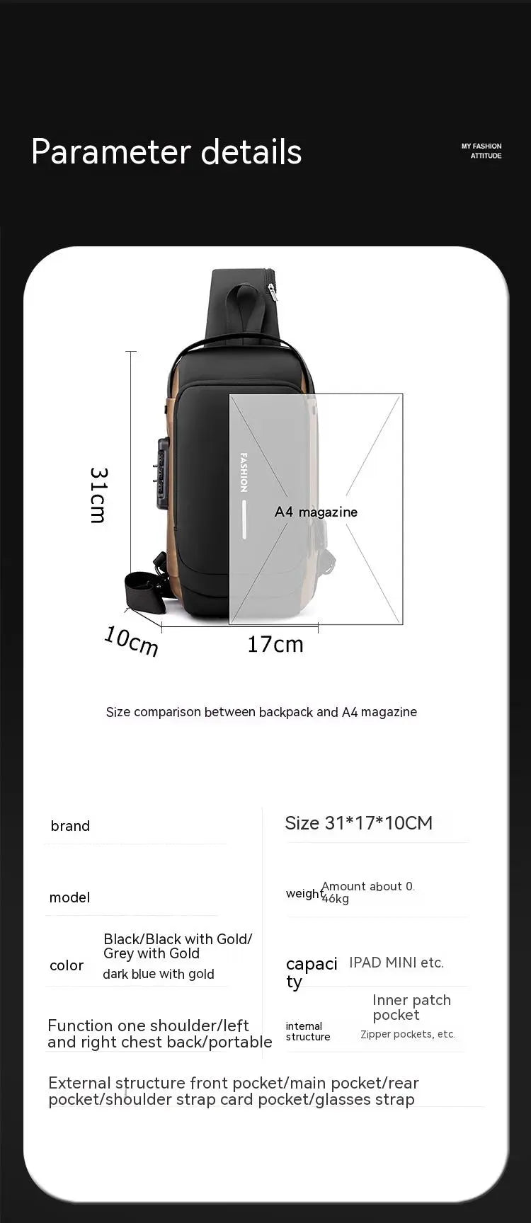 Stylish anti-theft crossbody bag for men, featuring password lock, USB charging port, waterproof and wear-resistant material, ultra-lightweight, ergonomic for spine protection. Material: Leather & Cloth. Main compartment, solid color options. Size: 32x18x10 cm.